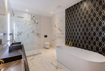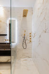 The final bathroom is bold and dramatic — black and white marble-look slabs contrast beautifully, and the custom Ideagroup vanity with integrated lighting adds both form and function.